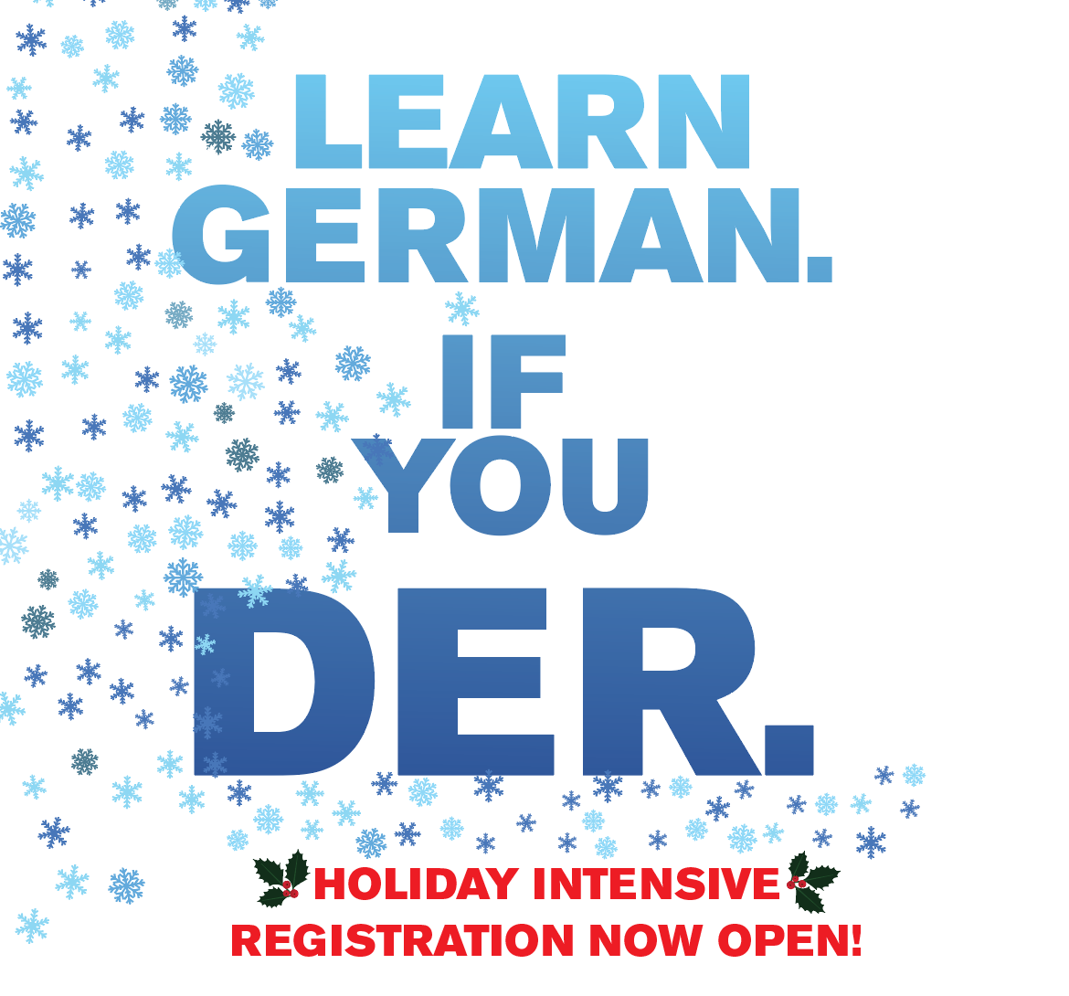 This year, Deutsches Haus at NYU's Holiday Intensive Term is all about beginners! This Intensive Term is designed to fit the entire A1.1 level into three weeks of classes - and will finish up right before the holiday season and New Year! Start your New Year's resolution early this year and sign up for this fun and festive German class. All of our classes are open to the general public. Seats are limited, so sign up soon!