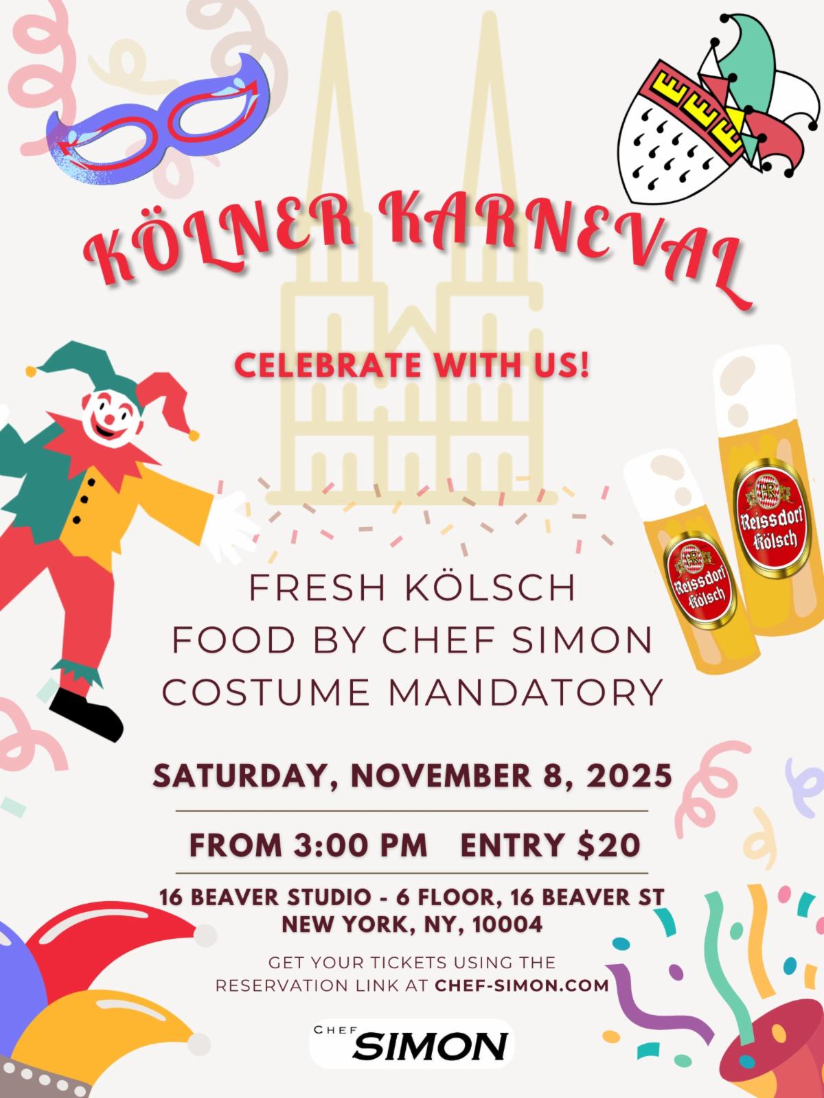 Be part of the excitement at their traditional party on November 8th, 2025. The festivities start at 3:00 PM, featuring the iconic KÖLSCH and lively Karneval music throughout the day. Indulge in delectable bites prepared by Chef Simon, adding a culinary flair to the vibrant atmosphere.