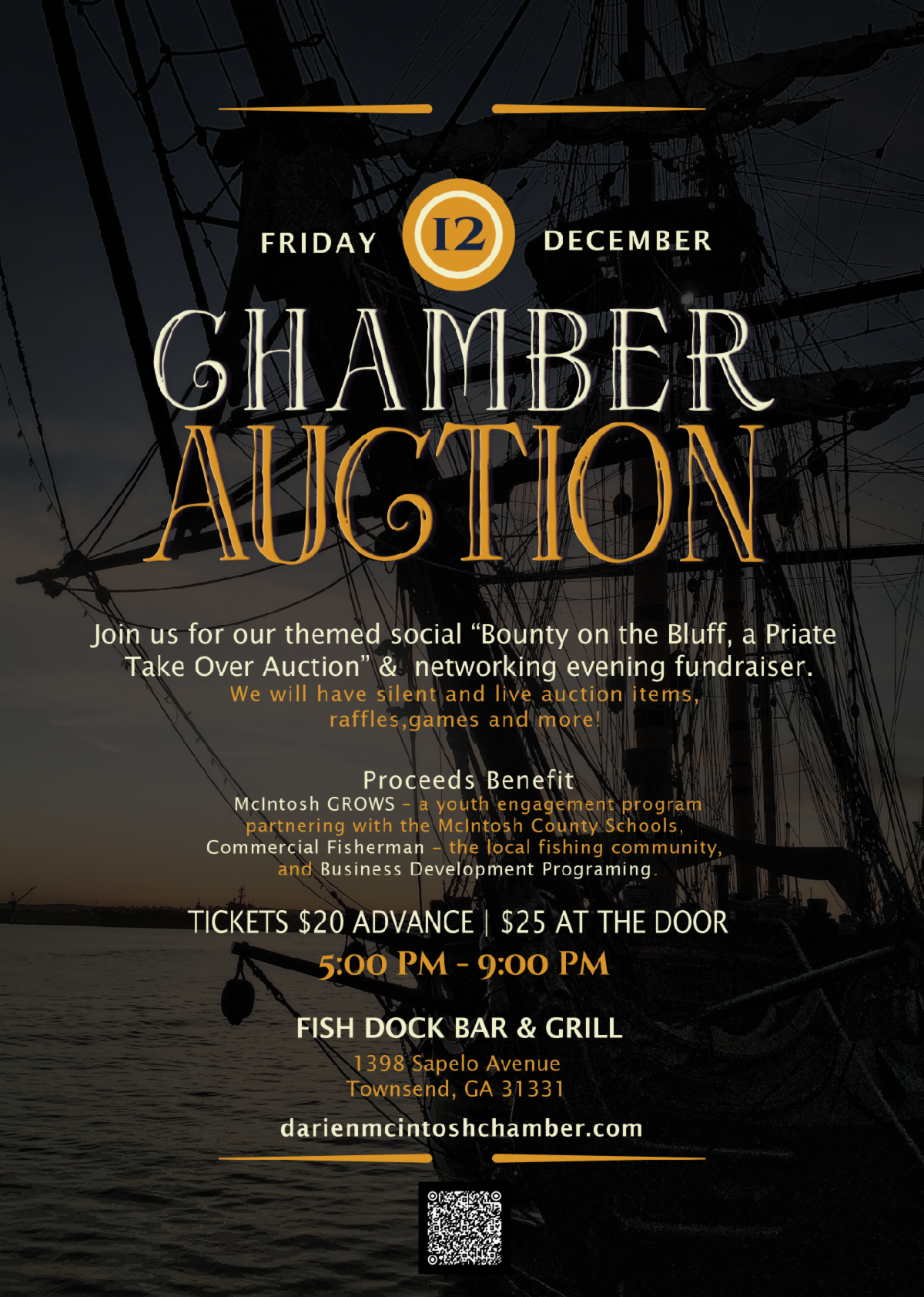 The Annual Chamber Auction will take place December 12th at Fish Dock Bar & Grill. "Bounty on the Bluff, a Pirate Take Over of the Auction" our themed social and networking evening fundraiser! We will have silent and live auction items, raffles, games and more! Your attendance and sponsorship help fund our initiatives which include; McIntosh GROWS – a youth engagement program partnering with the McIntosh County Schools, Commercial Fisherman Support– supporting the local fishing community and Business Development Programing – offering new services and programs to better support our businesses.