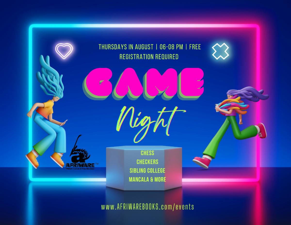 Do you like Scrabble, Chess, Mancala, checkers, or Sibling College and want to find a someone new to play with in person? Join us any Thursday from 6p-8p Aug 10, 17, 24, or 31 for 6-8pm for GAME NIGHT @ Afriware Books!!! Click this link to register for this free event. |