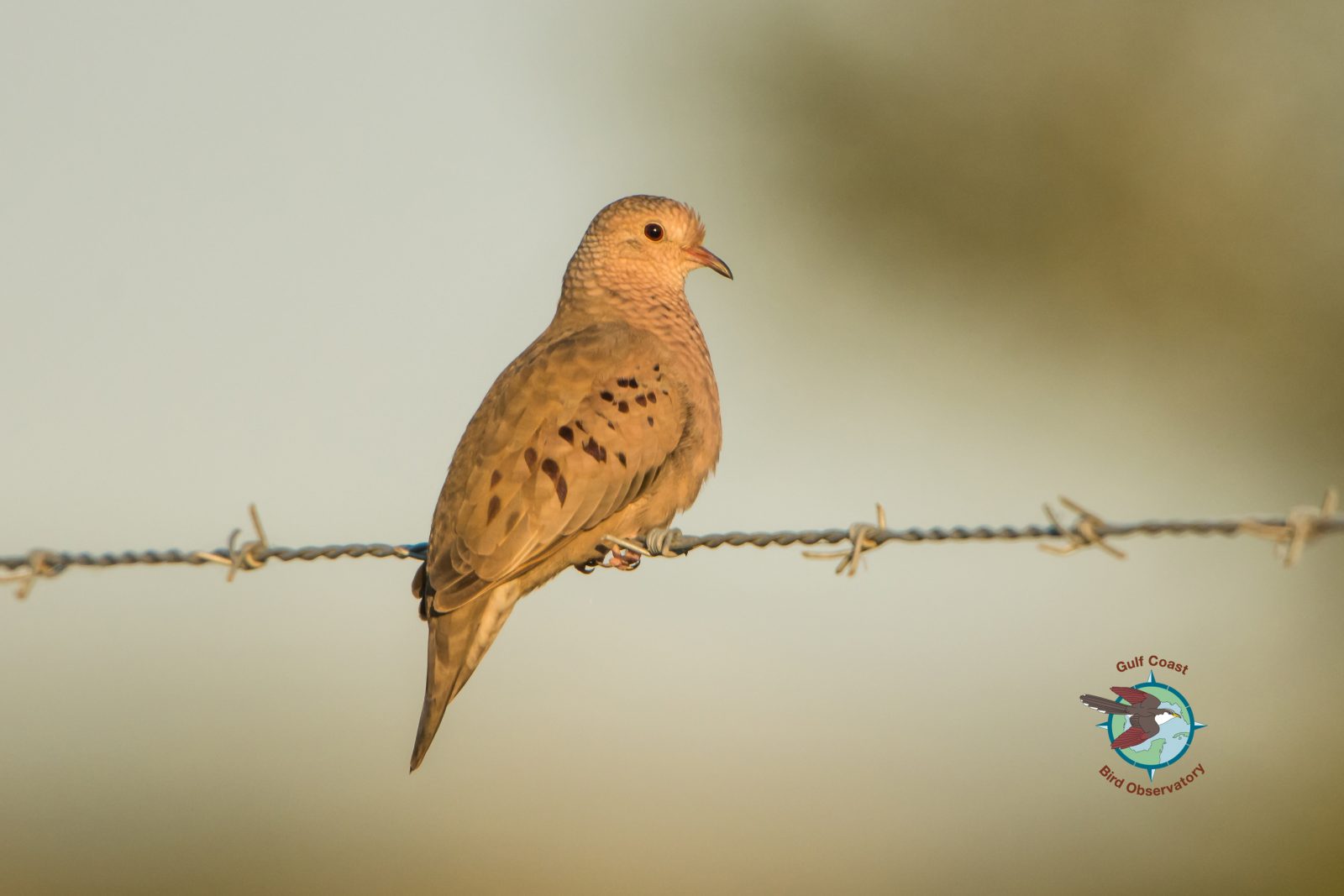 The Common Ground-Dove is a member of the Columbidae Family (Pigeon and Doves). Common Ground-Dove is tanish overall and identified by its red eye, pinkish/red bill base, scaled pink-gray breast and nape, and the dark brownish spots on the coverts. In flight, the underside of the wing will be entirely rufous, the primaries will be a bright rufous with black tips, and the tail is short and dark with white tips on the outer tail feathers. Typical weight is 1.1 oz or 30 grams. The song is a series of soft cooing notes, “coo-oo, coo-oo, coo-oo”, while the call is a guttural squawk during courtship or while fighting for position at a water source.