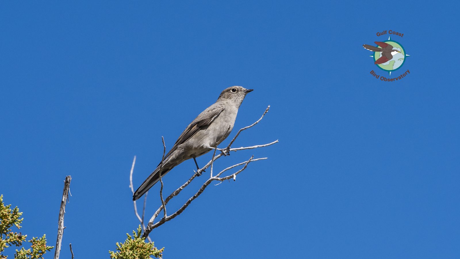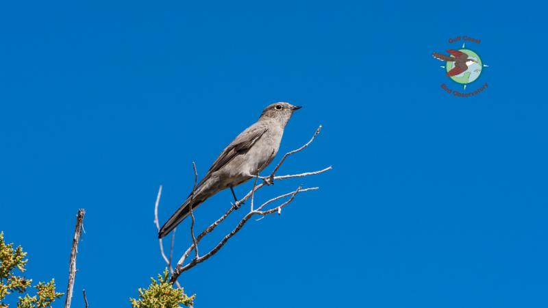 Townsend’s Solitaire is a member of the Turdidae Family (Thrushes). It's identified by its white eye-ring, plain gray body, and intricate wing pattern. In flight, the wing shows black flight feathers with a bold buffy stripe on both the top and underside of the wing and the tail has white outer feathers. While in flight, they flick open their tail and often have an irregular flight pattern changing directions quickly. Both sexes are similar. Although they are a thrush, they perch upright atop trees and shrubs to advertise their territories all year long and can easily be mistaken for a flycatcher as they frequently return to the same perch. Their typical weight is 1.2 oz or 34 grams. The song is a long continuous series of clear warbled notes while the call note is a whistled “whee”.