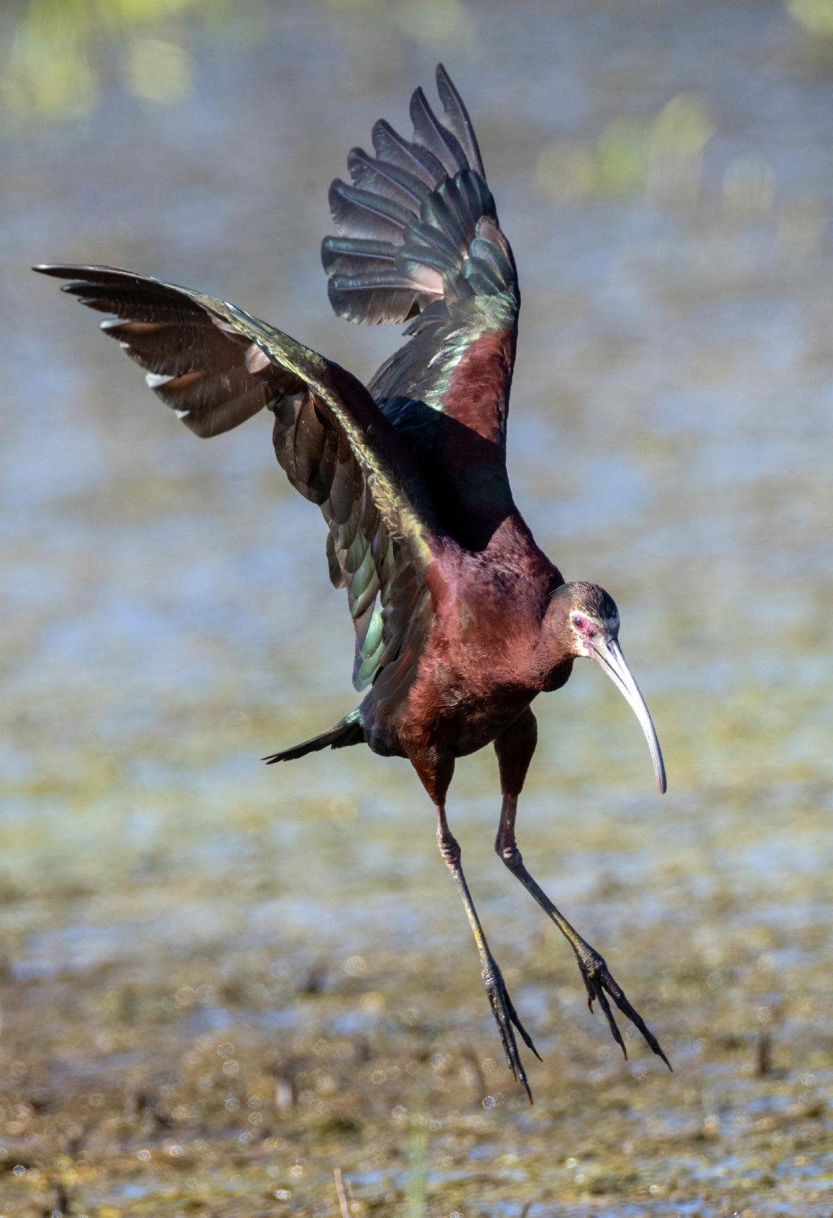 White-faced Ibis are typically 18-20 inches long with long legs and a long decurved bill. Plum-age is brown green and is iridescent in bright sunlight. Wings and back are greener with under-parts and neck/head being browner. The skin around the eye is red and is brighter during breeding with a distinctive white edge. The bill is gray and the legs red again being much brighter in breeding season. Note immatures are paler and their eyes are brown not red.