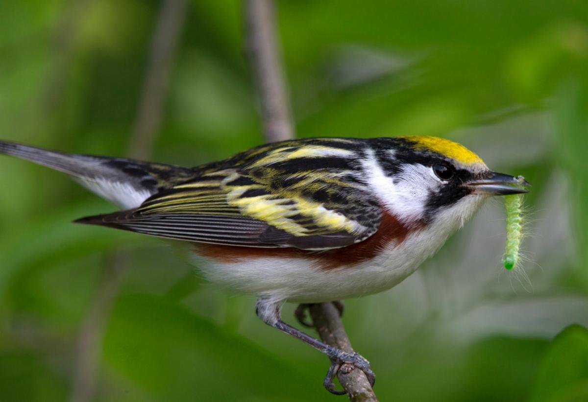 The Chestnut-sided Warbler typically feeds on insects (especially caterpillars) and spiders but will eat berries and seeds in Winter. It forages in the low to mid canopy and is a gleaner – pulling its prey from the underside of leaves while perched. When feeding, these birds are highly active and fast moving. In Winter these warblers often scavenge as part of a mixed flock