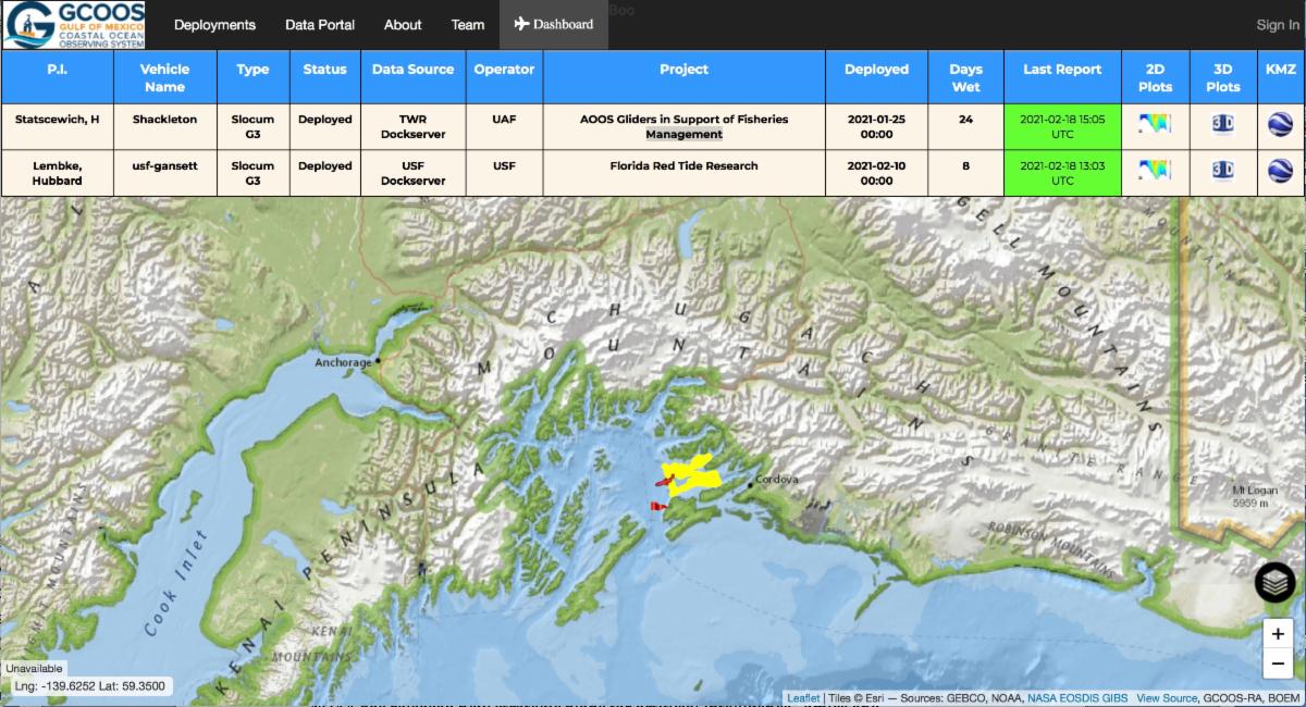 Well… actually, Alaska is coming to us! GCOOS’s dashboard for piloting and tracking autonomous vehicles is now being utilized by researchers working in Prince William Sound.