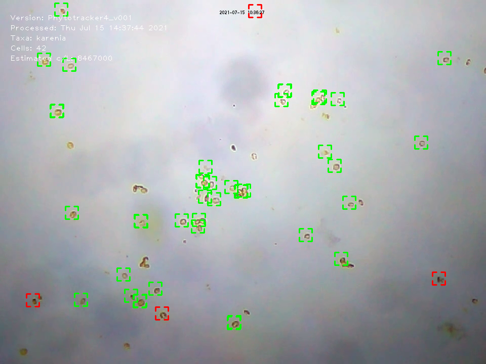 Karenia brevis cells are indicated by the green boxes in this HABscope image.