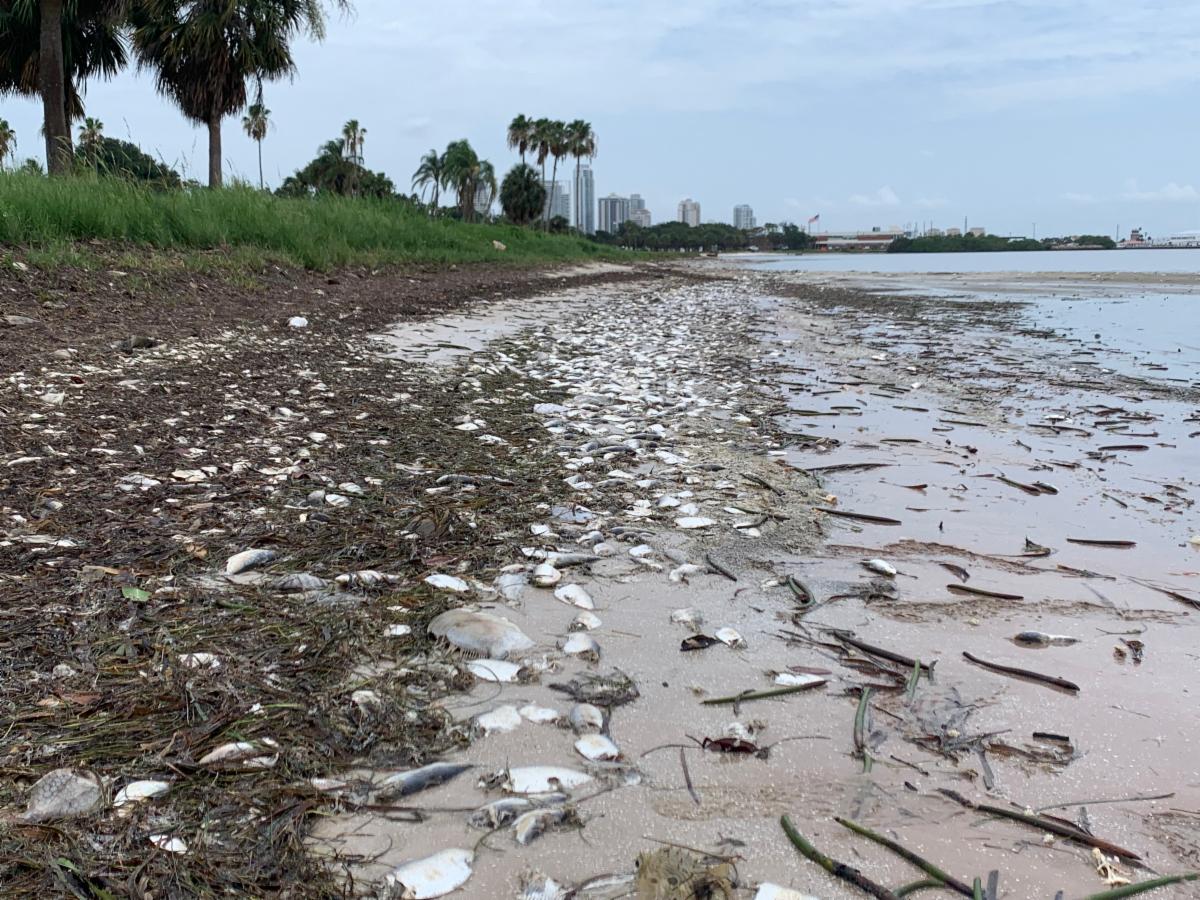 Dead fish litter the beach at Lassing Park in St. Petersburg.
