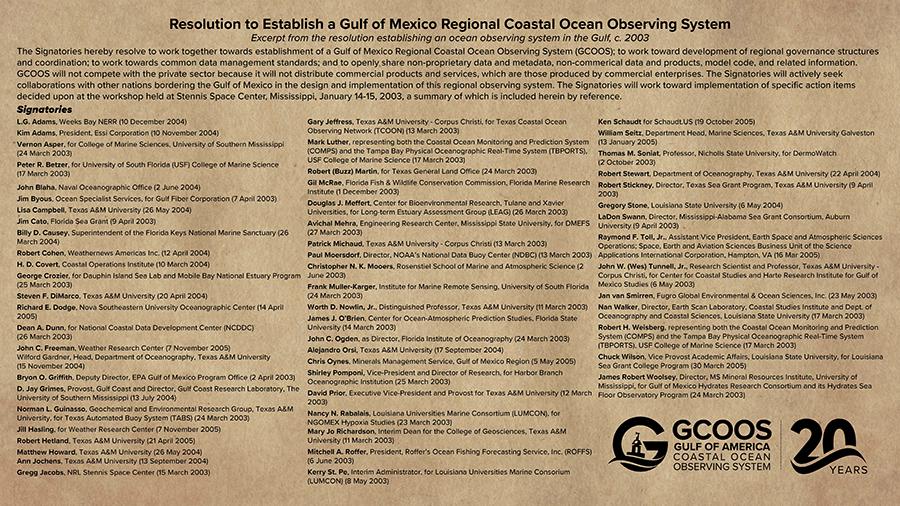 We thank Capt. Toll and the 59 other signatories on the GCOOS establishing resolution (excerpted in the image below) and for their dedication and work to developing and implementing the GCOOS regional association in those early days! (View the resolution excerpt as a PDF here.)