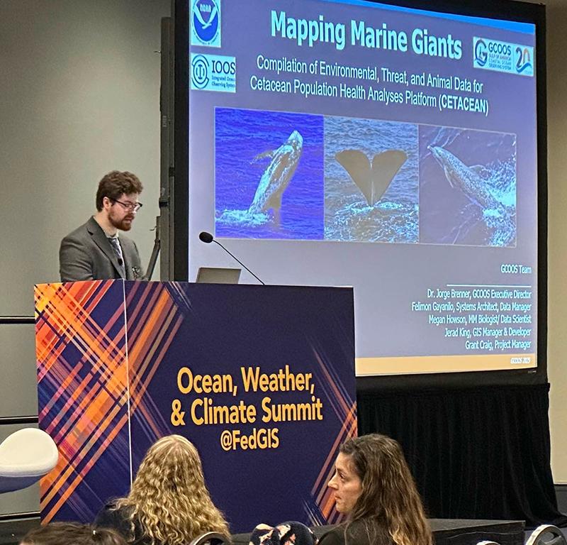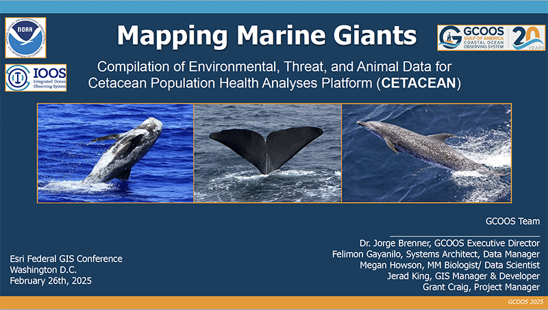 | | GCOOS GIS Manager Jerad King gave a presentation at the recent Esri Federal GIS Conference during the opening plenary of the Oceans, Weather and Climate Summit. “Mapping Marine Giants” focused on the story of the CETACEAN Data Portal created in the wake of the Deepwater Horizon Oil Spill, among the worst environmental disasters in history. CETACEAN, funded and guided by the Natural Resource Damage Assessment (NRDA) Trustee Implementation Group (TIG) and NOAA, was created as a portal for cetacean data that would support research, conservation and policy restoration for open-ocean cetacean species in the Gulf. The platform developed by the GCOOS GIS team uses an ArcGIS Hub populated with hundreds of meticulously processed datasets that consolidates threat and environmental data with decades of geospatial data on key cetacean populations, allowing scientists, conservationists and policymakers resource managers to access and visualize critical species distribution and migration information.