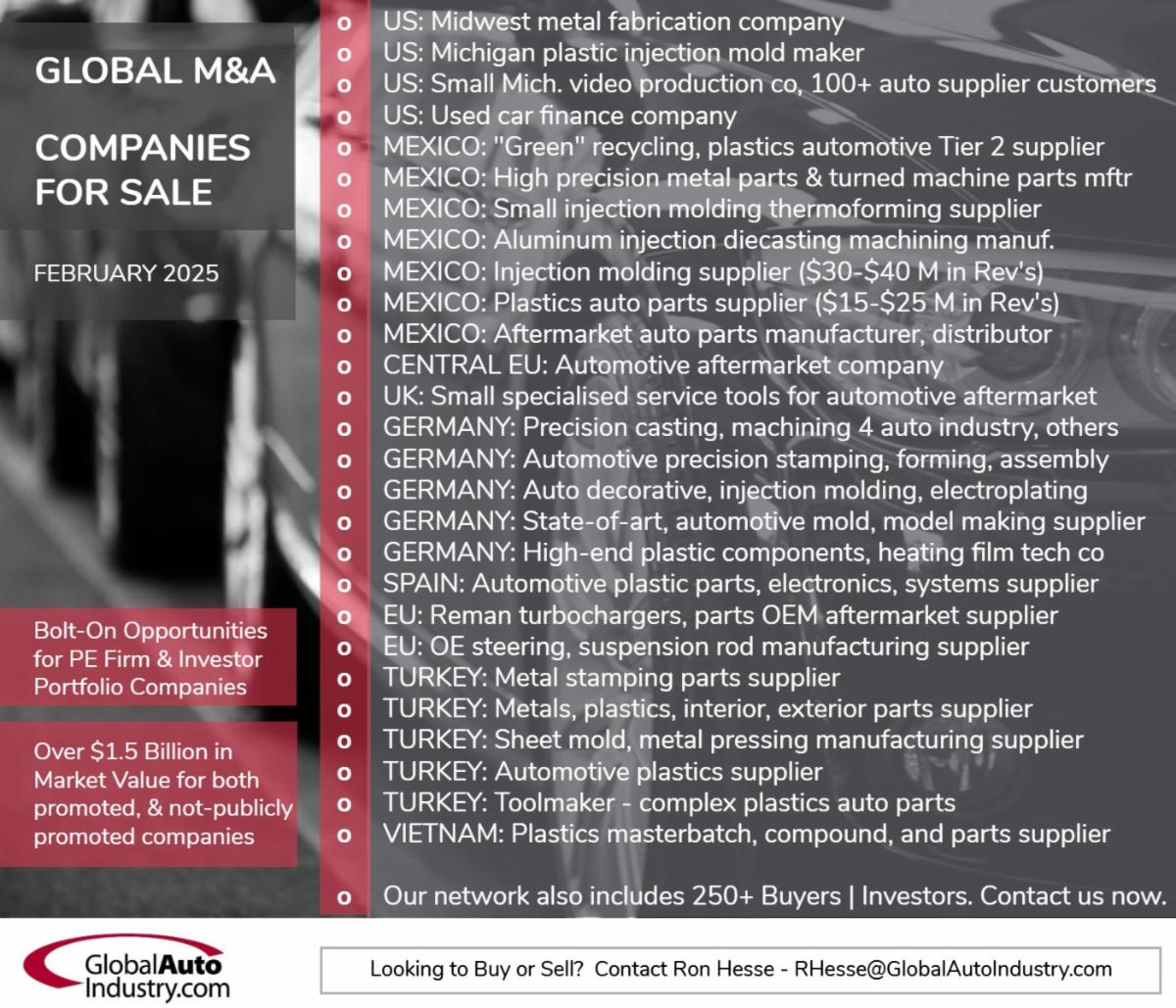 (2) “Automotive injection molding supplier” Revenues: $35-40M. ISO 9001: 2015, ISO 14000: 2008 | Assemblies Automotive and Appliances Electronics | 28 IMM 50-160 Tons | 17 IMM 200-300 Tons | 28 IMM 350-650 Tons | 2 plants.