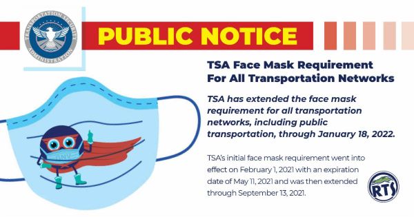Welcome back, UF and SFC students! One important thing to note when riding with RTS - the Transportation Security Administration (TSA) has extended its face mask requirement for all transportation networks through Jan. 18, 2022. This includes the RTS buses, so please ensure you’re wearing a mask before entering our buses. If you do not have a mask, the drivers will provide you with one.