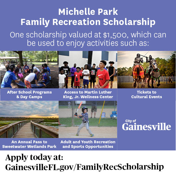 We are seeking nominations for the Michelle Park Family Scholarship! The scholarship provides one low-to-moderate income Gainesville family access to nature, recreation and cultural activities provided by the city and other providers in our community. The recipient family will be able to take advantage of a year’s worth of events, programs, tours and more at no cost. One scholarship, valued at $1,500, can be used to enjoy activities such as:
