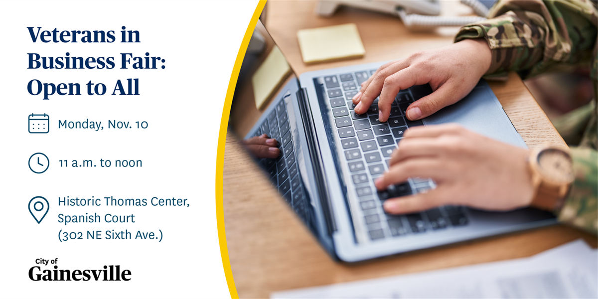 Veterans in Business Fair - Nov. 10 | The City of Gainesville Procurement and Contracting Division team is hosting its first veterans development business fair. At this event you can meet with procurement staff to understand the city's process, network with fellow veteran-owned businesses to share insights and receive information on available programs and resources. | | | | |