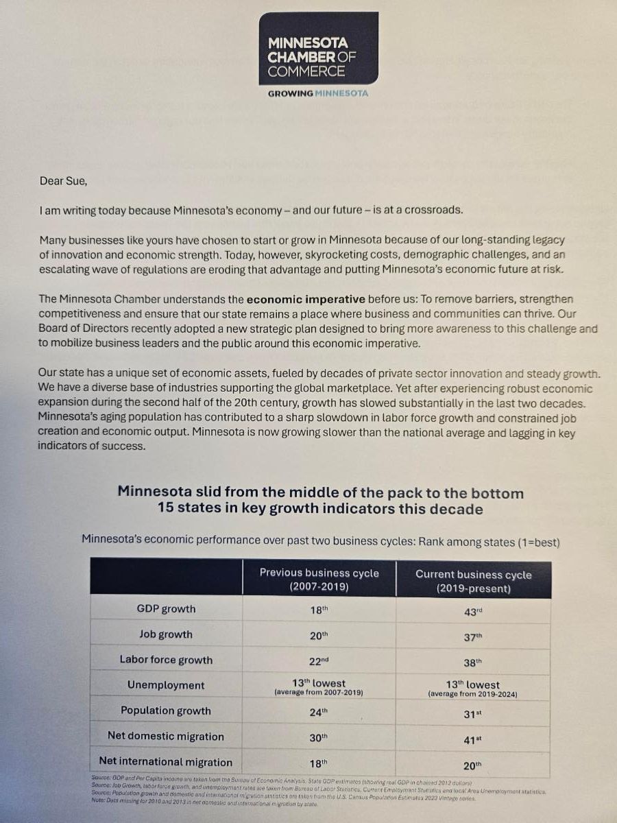 Minnesota is growing slower than the national average and lagging in key indicators of success. The key indicators show that we've gone from the middle of the pack to the bottom 15 states in business growth. We know that with today's skyrocketing costs, demographic challenges and continues waves of regulations - it's eroding the advantage of having a business in our state. Just know the MN Chamber is fighting for our businesses large and small!