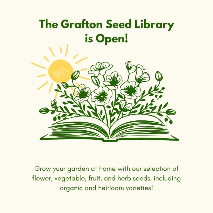 | | Our Seed Library is Open! Grow your garden at home with our selection of flower, vegetable, fruit, and herb seeds, including organic and heirloom varieties! Located at the second level in Borrower Services and Reference. | | In addition to the Libby app, we have another reading app for our Grafton residents. Hoopla has no holds and no waiting! These items are always available! | | |