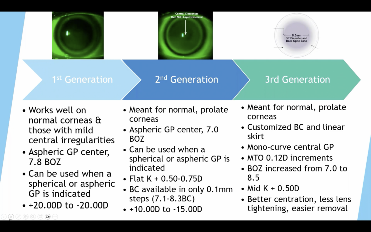 - Second generation: aspheric GP center, 3mm CN add zone for moderate-to-advanced presbyopes (adjustable CD zone for emerging-mild presbyopes and myopia management); +1.00, +1.75 & +2.50D adds for CN, +0.75 to +5.00D adds for CD.