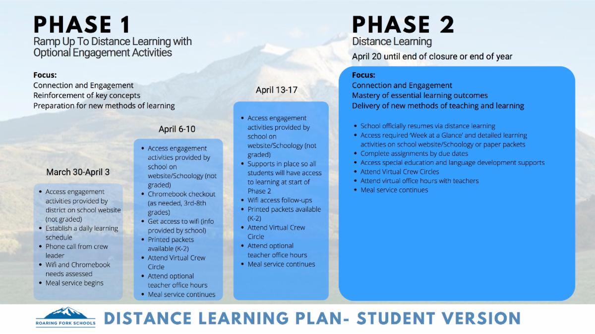 It’s April 1 and I feel that someone is playing a practical joke on us that is not funny and has gone too far. Unfortunately, our circumstances are all too real. We are learning that switching from bricks and mortar schooling to online schooling, is very complex. It is not just a question of firing up the computer and we are all ready to do school. That is why the Roaring Fork district plan is to have us move deliberately through phases.