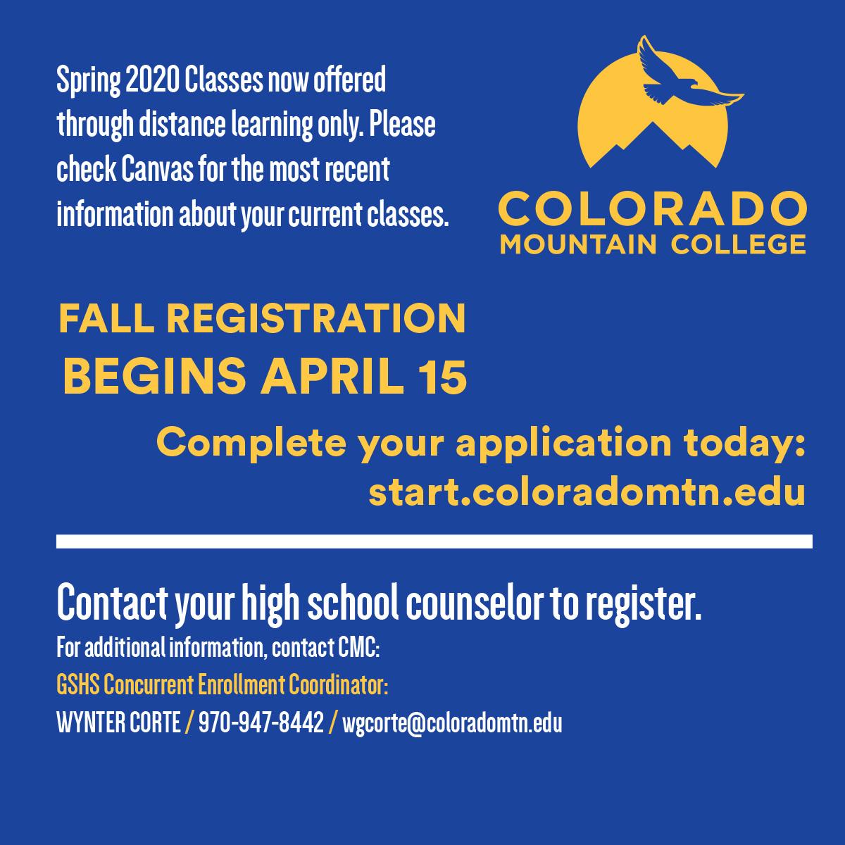 - CMC Concurrent Enrollment Coordinator, Wynter Corte, is available for questions! Contact Information: wgcorte@coloradomtn.edu (video-conferencing available by appointment!)