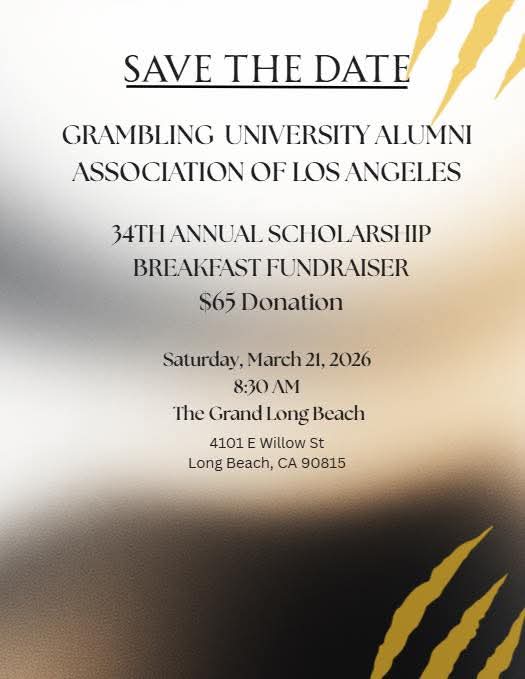 Join the Grambling University Alumni Association of Los Angeles for the 34th Annual Scholarship Breakfast Fundraiser and help support the next generation of Tigers. Mark your calendar for Saturday, March 21, 2026, at 8:30 AM at The Grand Long Beach, and be a part of a meaningful morning of fellowship, purpose, and impact. Your participation and $65 donation help open doors through education—don’t miss it!