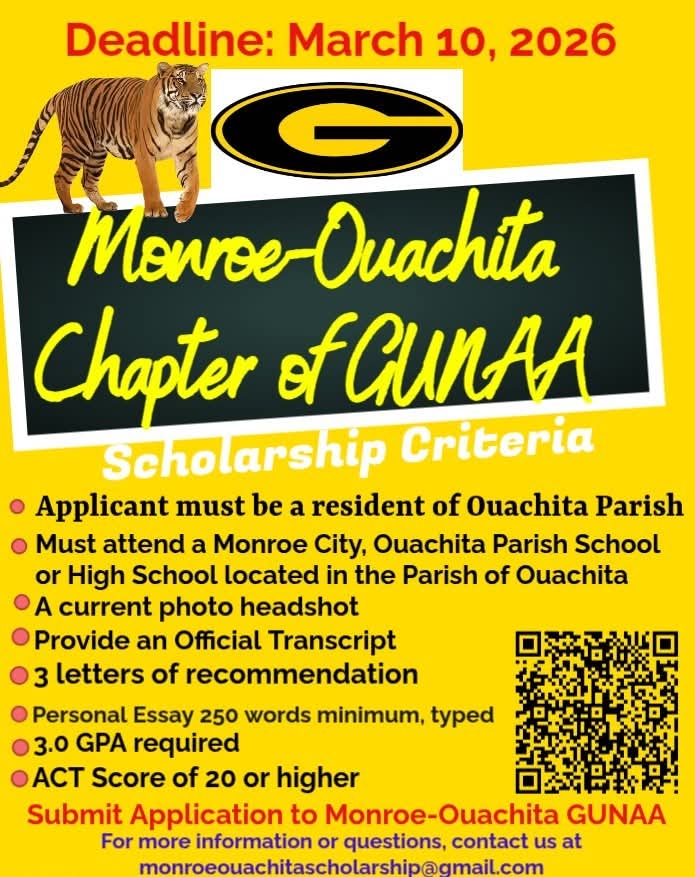The Monroe–Ouachita Chapter of GUNAA is now accepting scholarship applications—don’t miss this opportunity to invest in your future! Eligible students are encouraged to apply today and take the next step toward achieving their academic goals. Applications are due by March 10, 2026, so act now, gather your materials, and submit your application. For questions or more information, contact monroeouachitascholarship@gmail.com