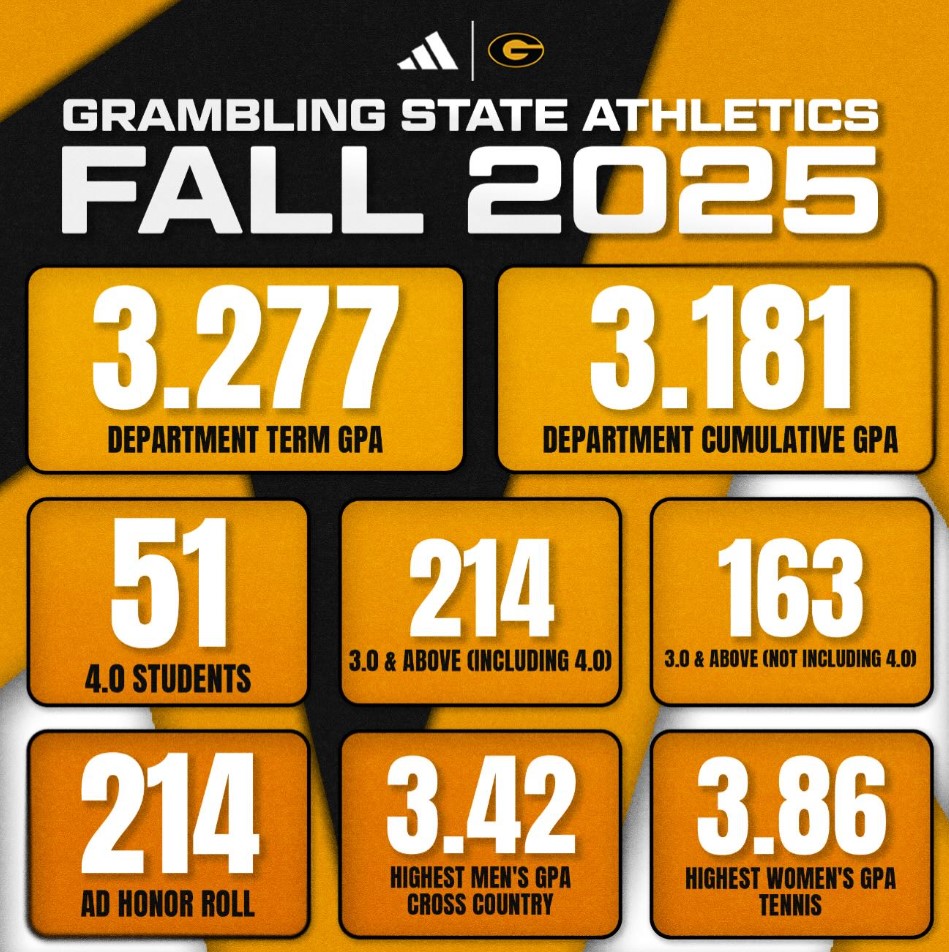 Congratulations to the Grambling State University Department of Athletics on an outstanding Fall 2025 academic performance, highlighted by a 3.277 term GPA and 3.181 cumulative GPA. With 51 student-athletes earning a 4.0 GPA and 214 achieving a 3.0 or higher, this achievement reflects a strong commitment to excellence in the classroom.