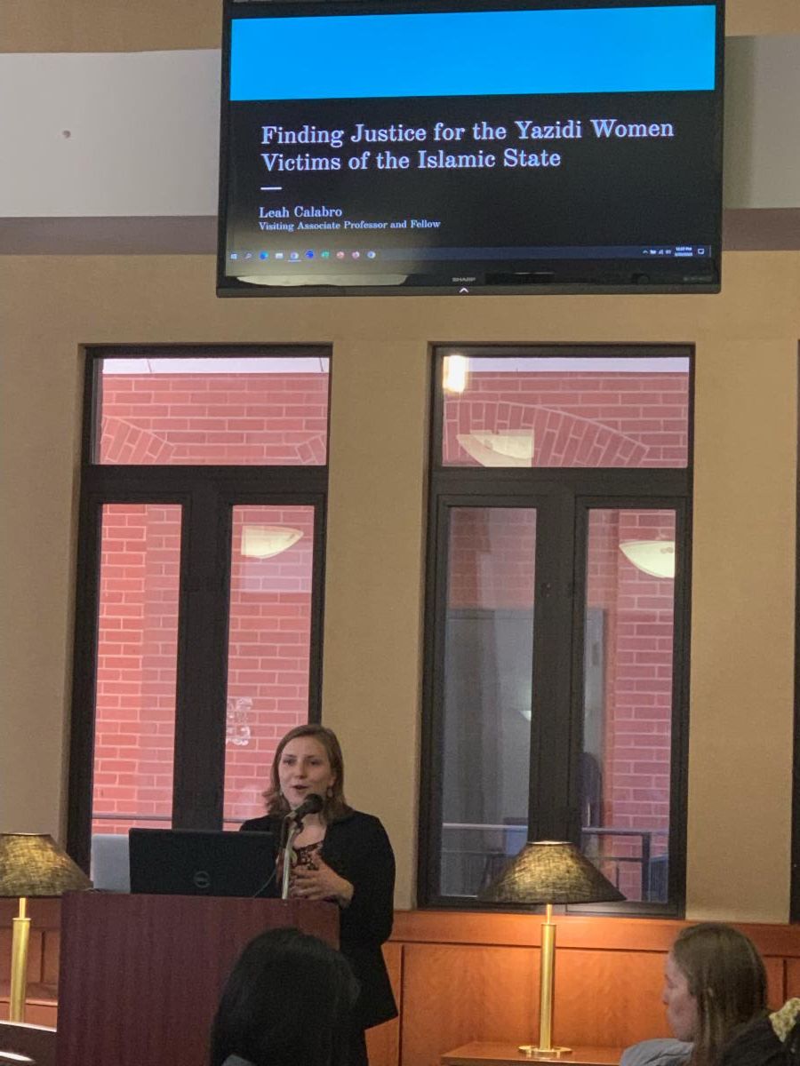 | | Professor Leah Calabro presented her research on the viability of various avenues for justice for the Yazidi women victims of the Islamic State several times this semester. First, in January 2023 as part of the Junior International Law Scholars Association Annual Meeting at Boston University. Then in March at an ICL Program-hosted event dedicated to the presentation of her work in progress open to students, faculty, and the public. In April, Professor Calabro presented her work at the GW Law Fellows Workshop with Professor Sean D. Murphy offering commentary. Also in April, the Washington Kurdish Institute organized a webinar for her to present her work to selected people doing work and research related to the Yazidi population from around the world and to engage in a discussion and receive feedback on her research proposals. Professor Calabro was asked to offer a mentoring session at the ASIL Annual Meeting in March. She also served as a Judge for the Jessup Moot Court Competition’s D.C. regional round in February.