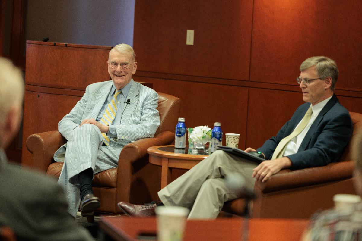 | | On April 13th, 2023, the ICL Program hosted a book launch and discussion with The Honorable Charles N. Brower on his recently published book, Judging Iran: A Memoir of the Hague, the White House, and Life on the Front Line of International Justice. The book discusses the extraordinary and lengthy international law career of Judge Charles Brower, including many high-profile positions in law firms and public service. Professor Sean Murphy moderated the wonderful conversation with Judge Brower, during which he discussed aspects of his book and spoke of his early career experiences. Associate Dean Celorio provided welcome remarks. Judge Brower closed the conversation with words of advice for the students in the room, which was followed by a book signing. The ICL program is grateful to Judge Brower for his ongoing support of the ICL program; for offering many opportunities to our students; and for advising several of our SJD students. Judge Brower has served as Distinguished Visiting Research Professor of Law at GW Law School, as well as Professional Lecturer in Law. He is one of most influential jurists of our time. A video of Professor Murphy and Judge Brower’s conversation can be found here.