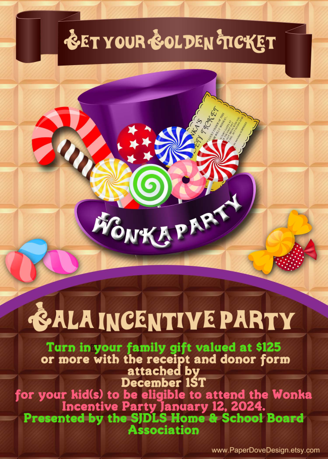 Happy New Year! The Saint Jeanne de Lestonnac Home & School Association is proud to present your GOLDEN TICKET to drop off your students to us as a thank you for turning in your Gala Gift Giving Donation on time!