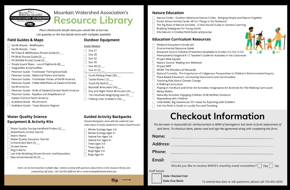 They also purchased detailed trail maps of the Laurel Highlands, field guides, binoculars for both adults and youth, and educational curriculum books for various environmental education topics. These materials and the activity backpacks are available to loan out, free of charge, as part of MWA’s Equipment Resource Library. They welcome local residents, visitors to the Laurel Highlands, and educators in the area to utilize these resources as part of their efforts for ecology education and outreach.