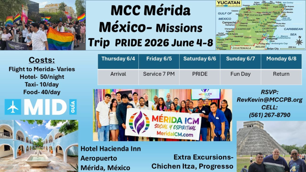 | | Tickets for the next concert of The Gay Men's Chorus of Tampa Bay are now on sale. On May 29th and 30th, GMCTB presents Love in Technicolor in St. Petersburg and Tampa. This concert will feature songs of love and heartbreak and songs from the movies. Click here to order your tickets today, and if you use the discount code EARLYBIRD10 before May 1st, you'll get 10% off your tickets. Get your tickets early, before they sell out! | | Would you like to join Rev. Kevin Konkle and MCC Merida-Iglesia de Amor, celebrate Pride on June 4-8, 2026? For more information on how you can join them, you can reach out to RevKevin@MCCPB.org. | | |