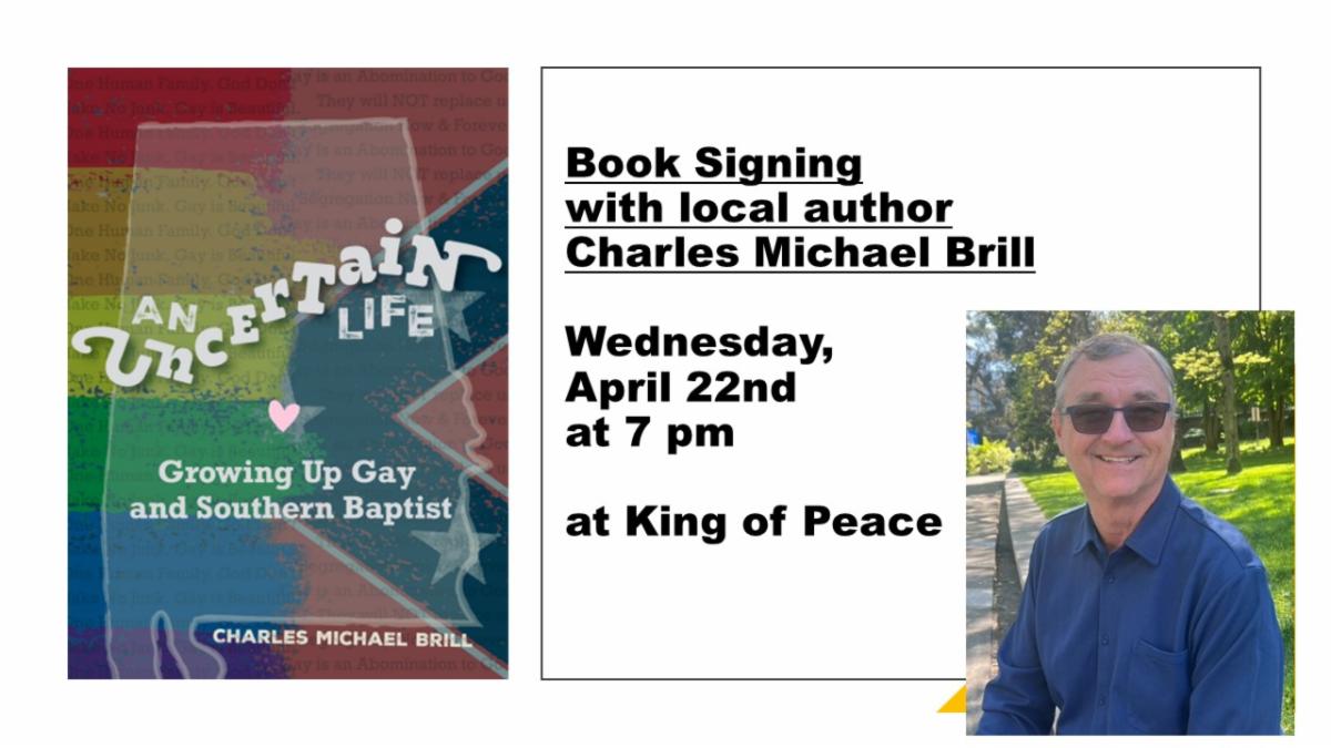 On Wednesday, April 22nd at 7 pm, King of Peace welcomes local author Charles Michael Brill for a special book signing of his work called "An Uncertain Life: Growing Up Gay and Southern Baptist". In this memoir, he takes us on a remarkable journey of his life. Raised in the South as a Southern Baptist, he wanted nothing more than to please God. As a child he faced difficult challenges resulting in a growing sense of worthlessness. As he came to know of God’s love for him, he began a long journey of self-discovery and acceptance and came to understand that God’s love was for all.