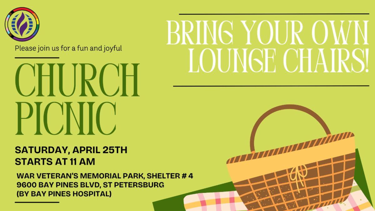 | | Our next church picnic will be on Saturday, April 25th at War Veteran's Memorial Park, starting at 11 am. If you plan to come, please sign up in the foyer or email melanie@churchstpetersburg.org to let us know what you plan to bring. If you've been before, you know this is always a good time! | | We are now collecting pictures for our special Mother's Day presentation on Sunday, May 10th. So, if you have pictures of your mothers and mother figures that you would like included, please email them to photos@churchstpetersburg.org, including their names. Photos will be accepted through Sunday, April 26th. If you don't know how to scan pictures, bring them to church on Sunday and Tim will help make that happen. Please note: Even if you have submitted pictures before, we are asking you to resend the picture you would like to have included. | | Our next monthly Dinner Club will take place on Monday, April 27th at 6:30 pm at Leverock's Great Seafood (840 Pasadena Ave. S., St. Petersburg). This is always a great time of food and fellowship. We hope you'll join us if you're able. | | |
