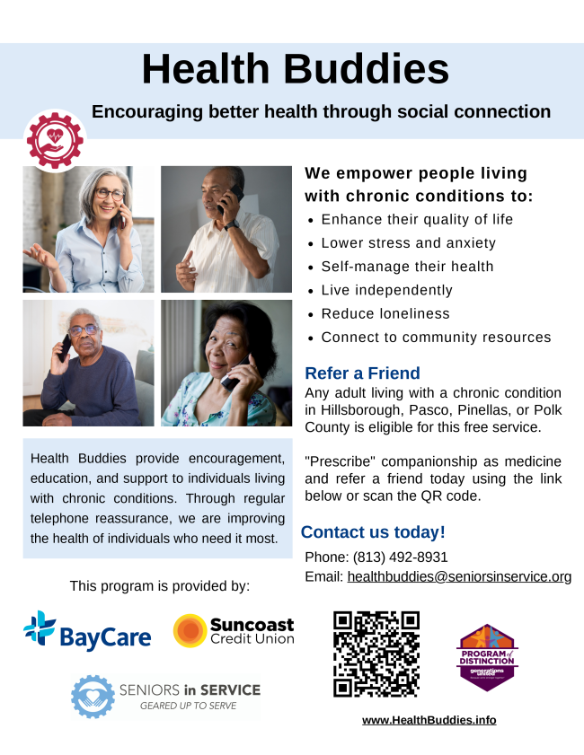 Health Buddies is a free, 12-week phone-based program for adults 18+ who are experiencing isolation or managing chronic health conditions. Participants receive weekly calls from trained, background-checked volunteers who provide encouragement, companionship, and basic health education, helping reduce feelings of loneliness and support self-management of chronic issues.