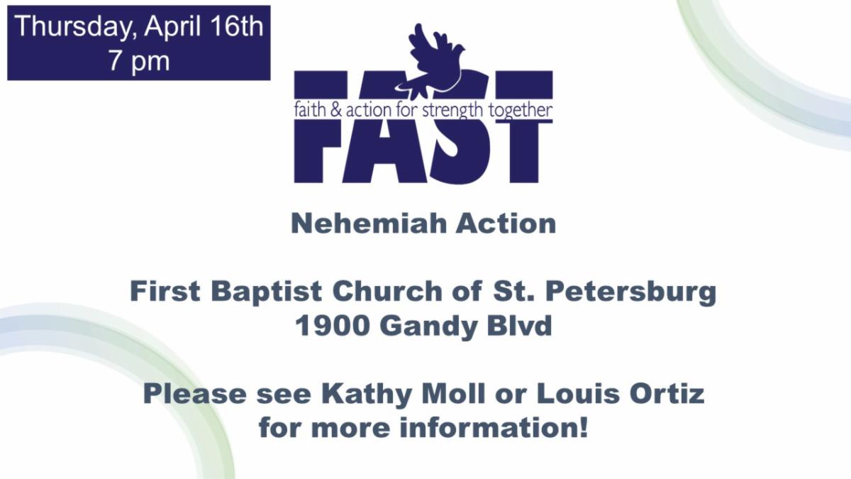| | If you like to play board or card games, join us tonight, Wednesday, April 15th for a Game Night. Feel free to bring some of your favorite games to play and your favorite chips and dips to share! If you have any questions, see Jeremiah! | | Grab your purple shirt and join us for the FAST Nehemiah Action on Thursday, April 16th at 7 pm at First Baptist Church of St. Petersburg, located at 1900 Gandy Blvd. FAST stands for Faith and Action Stronger Together, and King of Peace has become a partner congregation in the last year. During the FAST Nehemiah Action, all partnering congregations will come together, along with invited elected officials to discuss some very important justice oriented topics that are affecting Pinellas County. If you have any questions or want more information, see Kathy Moll or Louis Ortiz. You can also visit the FAST website here. | | |