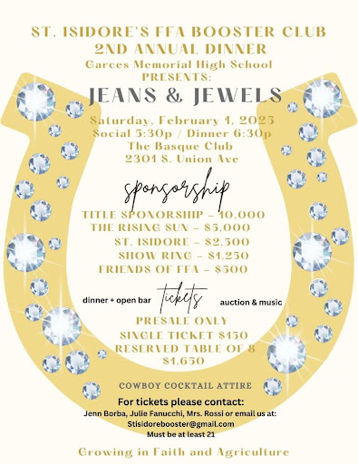 On February 1, 2025 we will have our annual Jeans and Jewels event. This is an event you do not want to miss! Join us for a memorable night supporting our FFA program. Tables and tickets are for sale! Get yours before we sell out!!