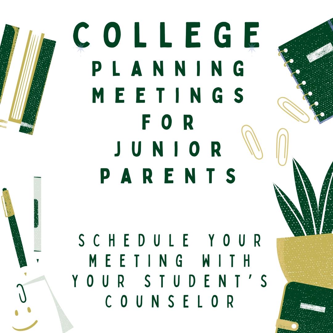 Junior parents are invited to schedule individual college planning meetings with their student's counselor. These meetings will cover important topics such as Naviance, college admissions requirements, financial aid, and more.