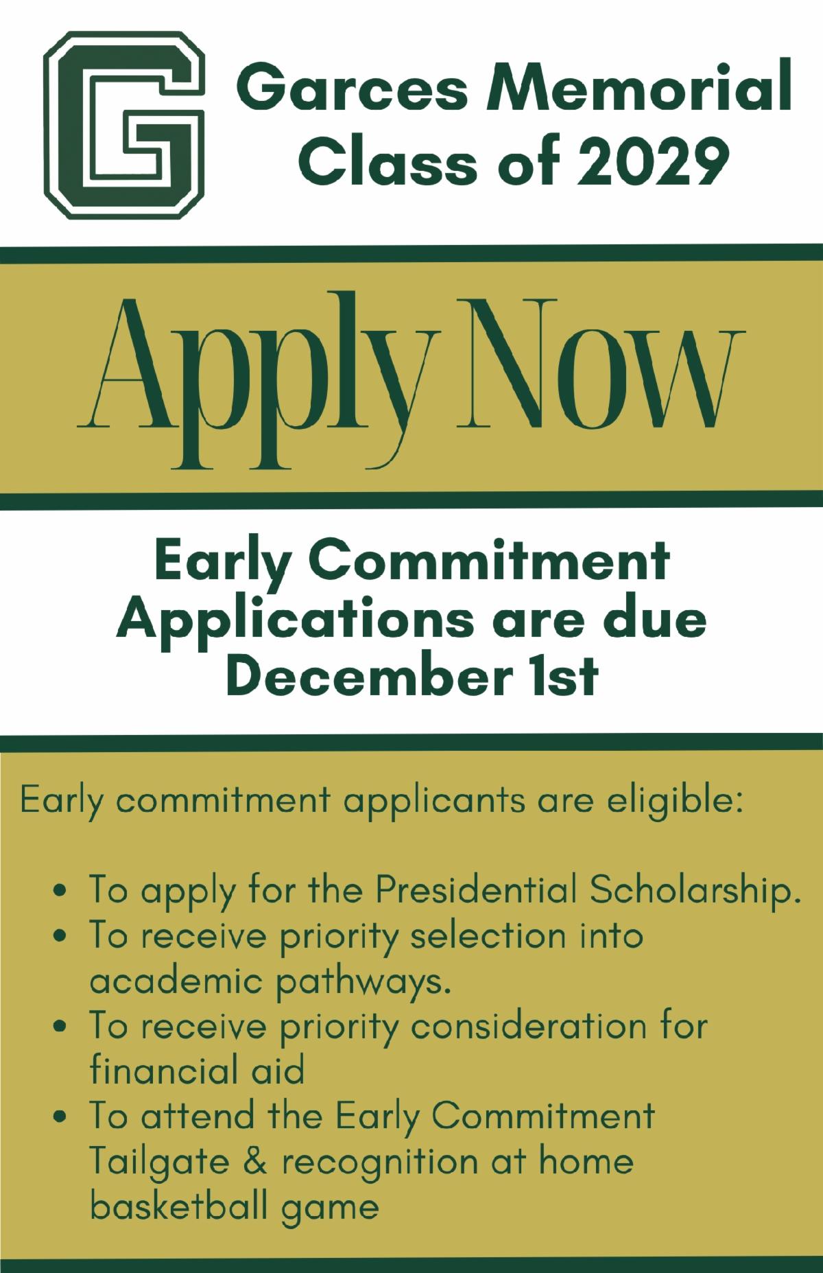 This year Garces Memorial is offering incoming freshman who submit their application for admission by the December 1st early commitment deadline the opportunity to apply for the Presidential Scholarship. We will award three (3) $3,500 merit based scholarships to deserving students from the Class of 2029. The scholarship will be applied to their 2025-26 Garces tuition, and will be awarded for all four years while attending Garces Memorial. The deadline for the scholarship application is December 1st. Recipients of the award will be announced December 15th. Remember you must have your student's application for admission submitted by the December 1st deadline to be considered for the Presidential Scholarship.