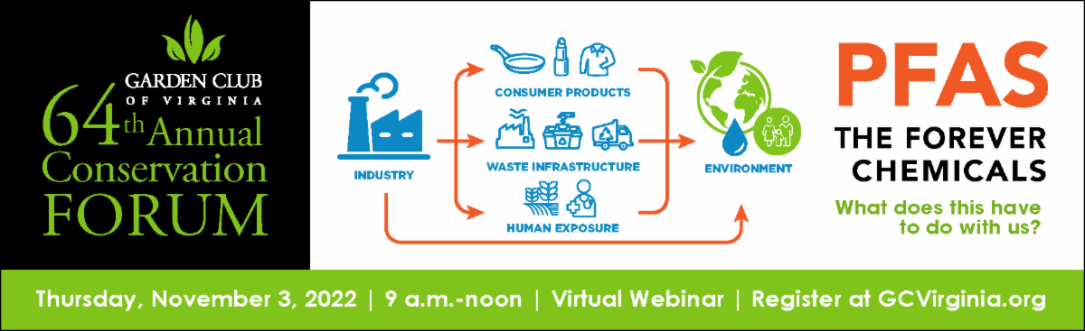 The 64th Conservation Forum is just days away! Don’t forget to register for this virtual webinar featuring Virginia-based experts on PFAS, the Forever Chemical, this Thursday, Nov. 3, 9 a.m. until noon. Listen, learn and ask questions about this very important topic.