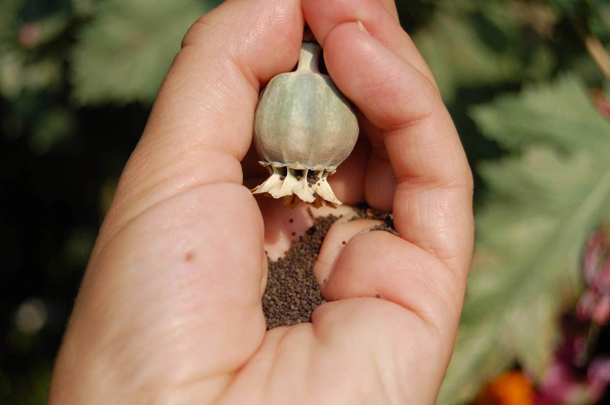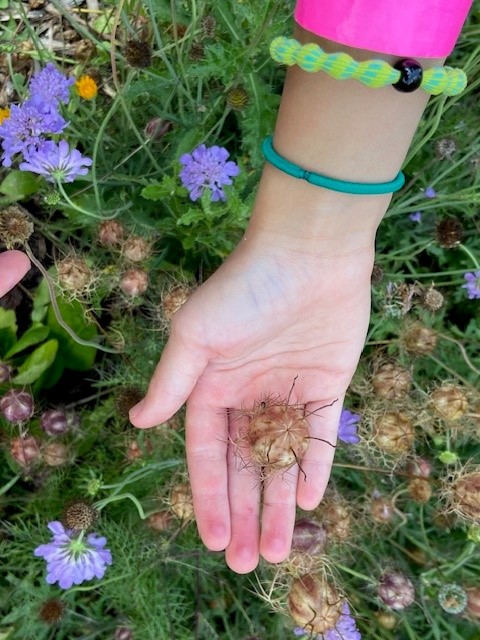 Poppies are the perfect example: cut the seed pod carefully, turn it upside down over the outstretched hand of a child and tap the pod to release the seeds.