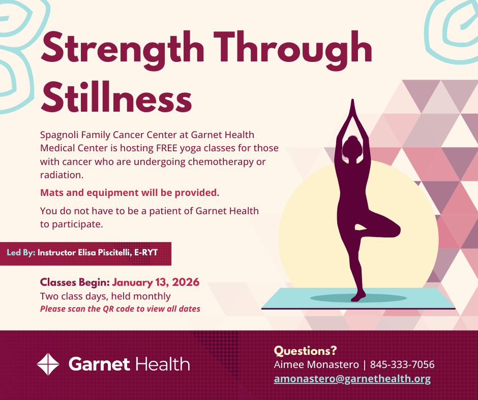 Spagnoli Family Cancer Center at Garnet Health Medical Center is hosting free yoga classes for patients currently undergoing chemotherapy or radiation for any type of cancer, as well as those within six months of completing treatment. Participants do not need to be a Garnet Health patient to register.