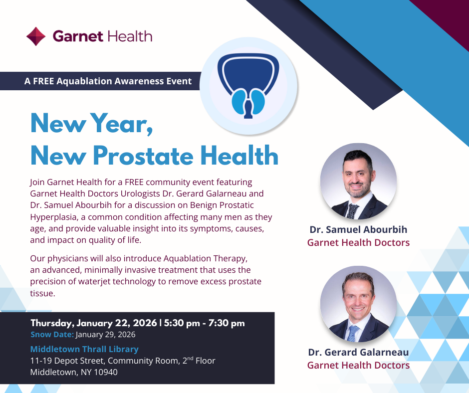 Garnet Health Doctors will host a FREE Aquablation Therapy awareness event on Thursday, January 22, from 5:30 pm to 7:30 pm at the Middletown Thrall Library located at 11-19 Depot Street, Middletown, NY 10940.
