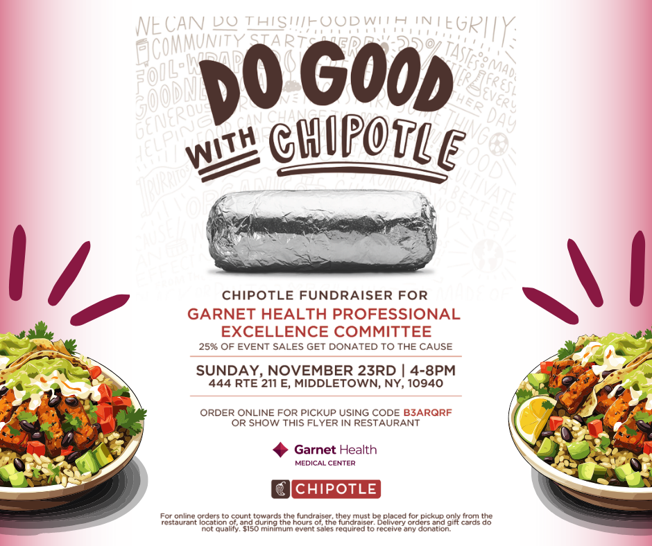 On Sunday, November 23 get your Chipotle fix between 4:00 pm - 8:00 pm as all in-person and online orders made during fundraiser hours will donate 25% of sales to the Garnet Health Professional Excellence Committee!
