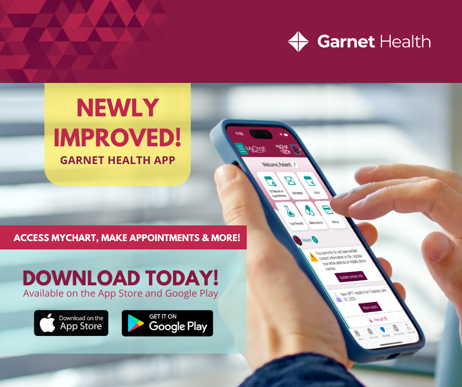 The Garnet Health app provides the convenience of accessing MyChart, making appointments, viewing lab results and MORE right in the palm of your hand!