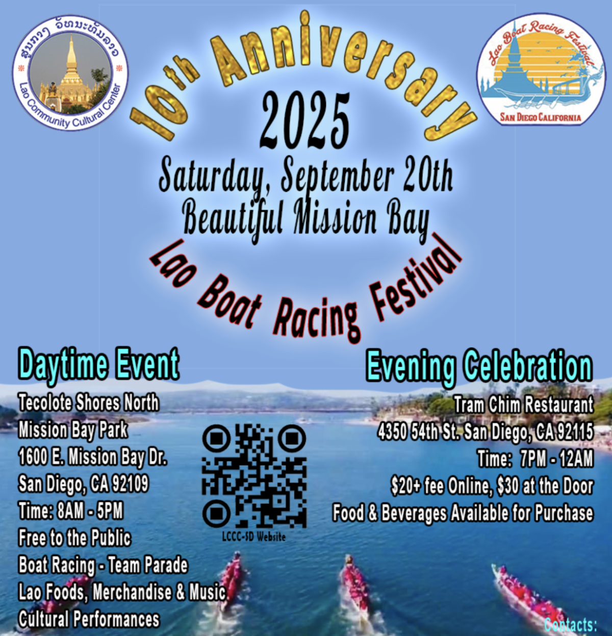 Celebrate the 10th Anniversary Lao Boat Racing Festival on Mission Bay from 8am to 5pm with boat races, cultural performances, and Lao cuisine. This event is free to the public. More information at laocommunity.org