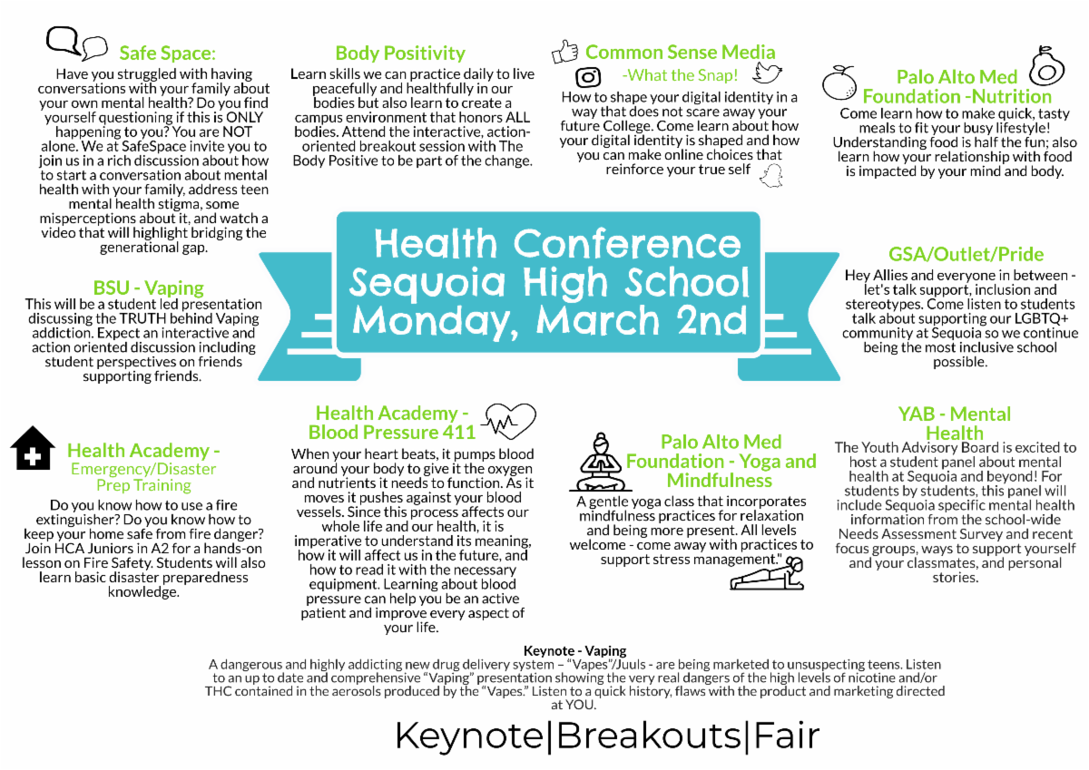 At this year's Health Conference, Sequoia students dive into physical and mental health topics such as positive body image, vaping, digital citizenship, mental health, mindfulness and much more.
