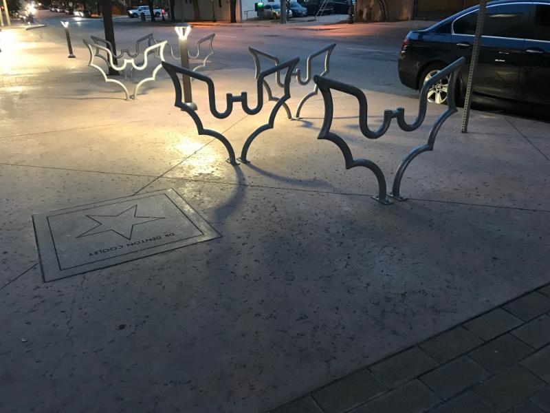 The bats that fly out over the Colorado River every summer evening are not the only bats in Austin -- there are also these more stationary versions, which await the locking of bicycles in front of the Austin Convention Center. We also spotted bike racks in the shape of musical notes, befitting Austin's self-imposed epithet of "Live Music Capital of the World."