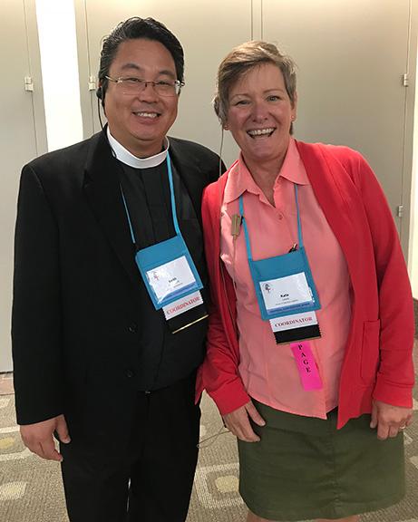 The Rev. Keith Yamamoto of St. Mark's, Upland, and the Rev. Kate Lewis of St. Columba's, Camarillo, are both serving as volunteers at General Convention, as they have for many past gatherings. Yamamoto is coordinator for Community Awareness (we think that's a softer term for "security"). Lewis is coordinator for House of Deputies Logistics.