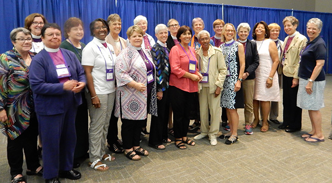 Women of the House of Bishops welcome their new member Griselda Delgado del Carpio (at center front in red shirt), bishop of Cuba, who was seated in the House immediately after the bishops voted unanimously to re-admit the Diocese of Cuba as a part of The Episcopal Church. Bishop Suffragan Diane Jardine Bruce of Los Angeles is at far left; right of Delgado is Bishop Barbara Harris, retired suffragan of the Diocese of Massachusetts and the first woman elected a bishop in the Anglican Communion; second from right is Katharine Jefferts Schori, immediate past presiding bishop.