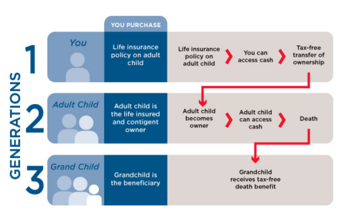 When you purchase the plan and insure your child, they have a valuable asset right away: life insurance protection. You can transfer the policy to them at any time tax-free, however, most people will transfer the policy at the time of their passing. This is done seamlessly by naming them as a contingent owner on the plan. As the new owner, they now have access to all the money that is growing inside the policy. This money can be used to help buy a home, supplement their retirement, or help fund their child’s education.