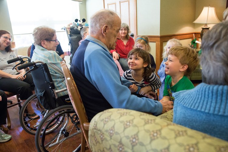 The mission at All Seasons Preschool is to provide a model early learning experience that meets children's developmental needs while fostering meaningful relationships with senior adults. All Seasons Preschool of Inver Glen and All Seasons Preschool of Eagan are intergenerational preschools housed inside two senior living buildings: Inver Glen Senior Living and Lexington Pointe Senior Living. Teachers lead intergenerational experiences every day, sometimes with an entire class and sometimes with a small group of children. All preschoolers participate in shared activities and roughly 25% of the seniors regularly participate with the children. Many more seniors participate for special events such as the Halloween fashion show, preschool graduation, or summer water wars. Learn more about All Seasons Preschool here.